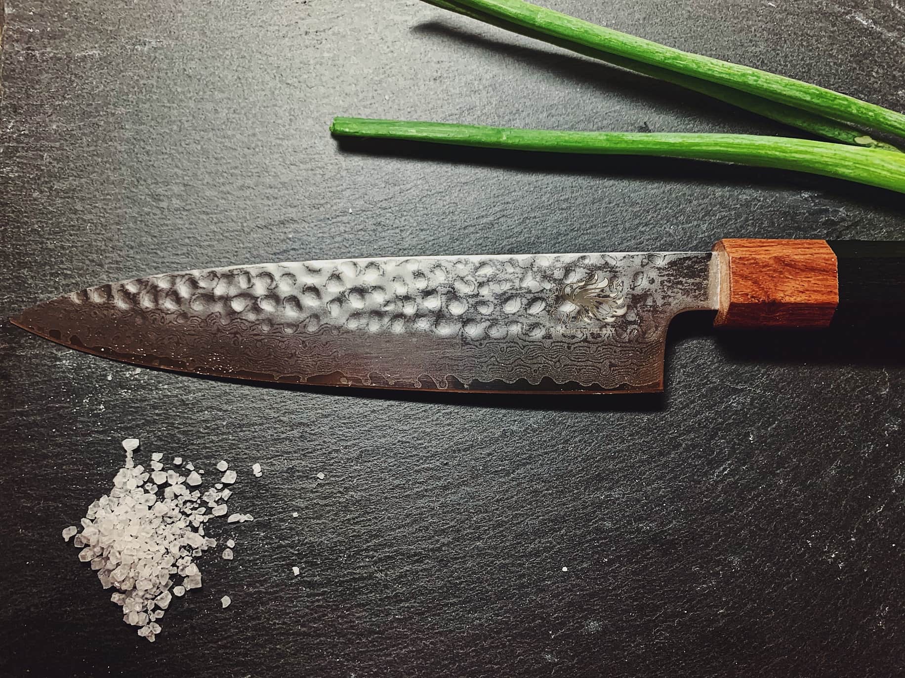 6.5 inch Nakiri Cleaver. The ideal, all-purpose knife. Forged in the traditional Japanese style with a symmetrical flat edge, donned with a black carbon and hammered pattern finish which reduces friction between food and the blade - the blade's beauty is only matched by its storied forging process. Crafted with 67 layers of authentic Japanese Steel with a stunningly beautiful Damascus pattern. The handle is in our signature octagonal style comprised of rose and black wood.