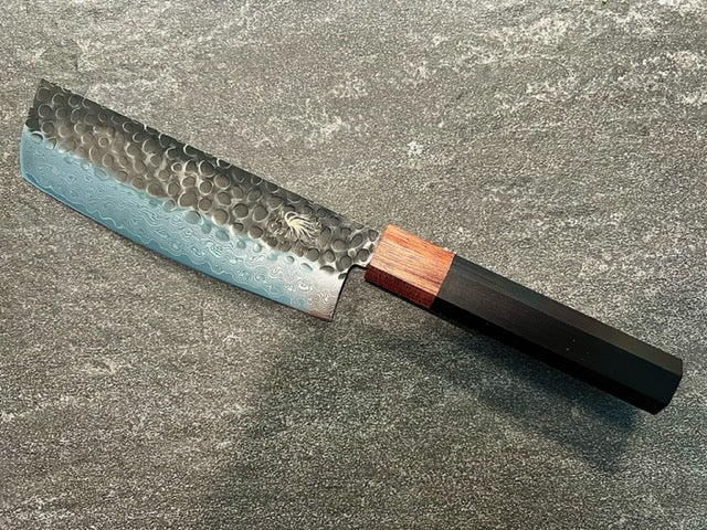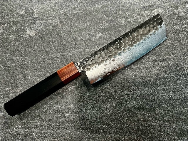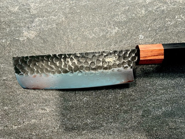 6.5 inch Nakiri Cleaver. The ideal, all-purpose knife. Forged in the traditional Japanese style with a symmetrical flat edge, donned with a black carbon and hammered pattern finish which reduces friction between food and the blade - the blade's beauty is only matched by its storied forging process. Crafted with 67 layers of authentic Japanese Steel with a stunningly beautiful Damascus pattern. The handle is in our signature octagonal style comprised of rose and black wood.